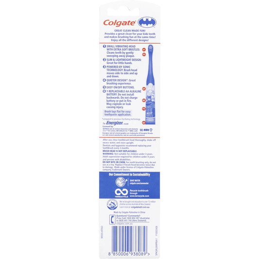 Colgate Kids Barbie or Batman Battery Powered Sonic Toothbrush for Children 3+ Years Extra Soft Bristles