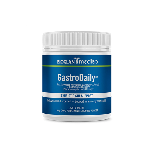Bioglan Medlab GastroDaily Synbiotic Gut Support (probiotics and prebiotics) Choc-Peppermint flavoured powder may help to relieve abdominal discomfort and support immune health.